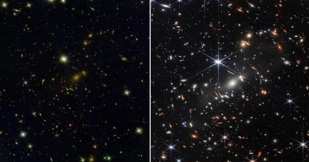 বাদবাকি যত আলোকবিন্দু দেখতে পাচ্ছেন, সবই একেকটি ছায়াপথ, তারকা নয় কিন্তু! হাবল টেলিস্কোপও আকাশের এ অংশের ছবি তুলেছিল, জেমস ওয়েবের সাথে তার পার্থক্য দেখে নিন!