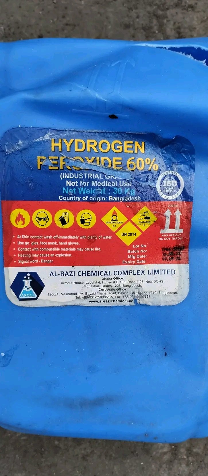Bdnews24.com (https://bdnews24.com/bangladesh/2022/06/05/a-bangladesh-depot-burnt-through-the-night.-did-a-chemical-keep-the-inferno-on) থেকে পাওয়া ছবিতে (২য় ও ৩য়) দেখা যাচ্ছে সীতাকুণ্ডের কন্টেইনার ডিপো থেকে উদ্ধার করা হাইড্রোজেন পারক্সাইডের আঁধার। ৬০% ঘনত্ব লেখা লেবেলে।