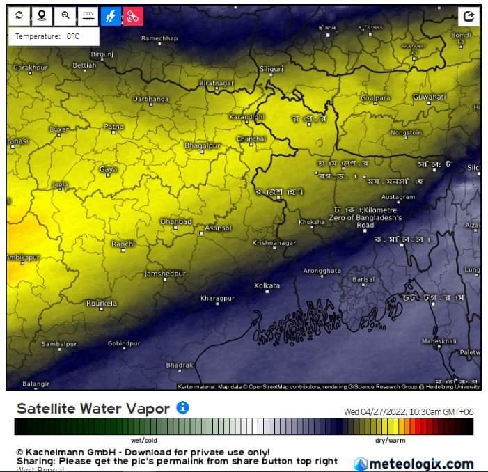 প্রথম ছবিটি নির্দেশ করতেছে ভূ-পৃষ্ঠ থেকে প্রায় ৫ কিলোমিটার উচ্চতায় প্রবাহিত বাতাসে জলীয়বাষ্পের পরিমাণ ও তার তাপমাত্রা। এই ছবিতে দেখা যাচ্ছে যে অপেক্ষাকৃত উচ্চতাপমাত্রার বাতাস প্রায় পুরো ভারত ও বাংলাদেশের উপর দিয়ে প্রবাহিত হচ্ছে। এই গরম বাতাস পুরোপুরি বাংলাদেশের উপর থেকে সরে না যাওয়া পর্যন্ত দিনের তাপমাত্রার কোন পরিবর্তন হবে না।