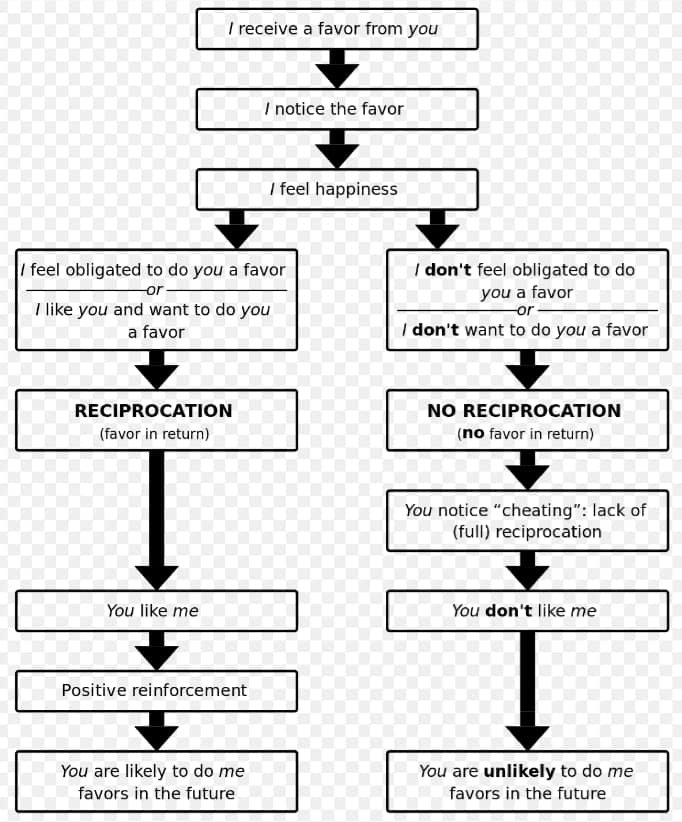 এবার, আমি তাকে সাহায্য করলাম প্রথমে, সেও কৃতজ্ঞ হলো, আমাকে চিনে রাখলো,আমি বিপদে পড়লে আমাকেও সাহায্য করলো,ফলে আমিও তাকে চিনে গেলাম। এভাবে যদি আমাদের উভয়ের প্রজাতিতে বা আমাদের প্রজাতিতে একাধিক এল্ট্রুইস্ট বা সাহায্যকারীর একাধিকবার সাক্ষাৎ হয়,তাহলে খুব সহজেই রেসিপ্রোকাল এল্ট্রুইজমের ইভোলুশনারী ভ্যালু বেড়ে যাবে আর তা একটা বা অংশগ্রহণকারী দুইটা প্রজাতিতে ছড়িয়ে যাবে।